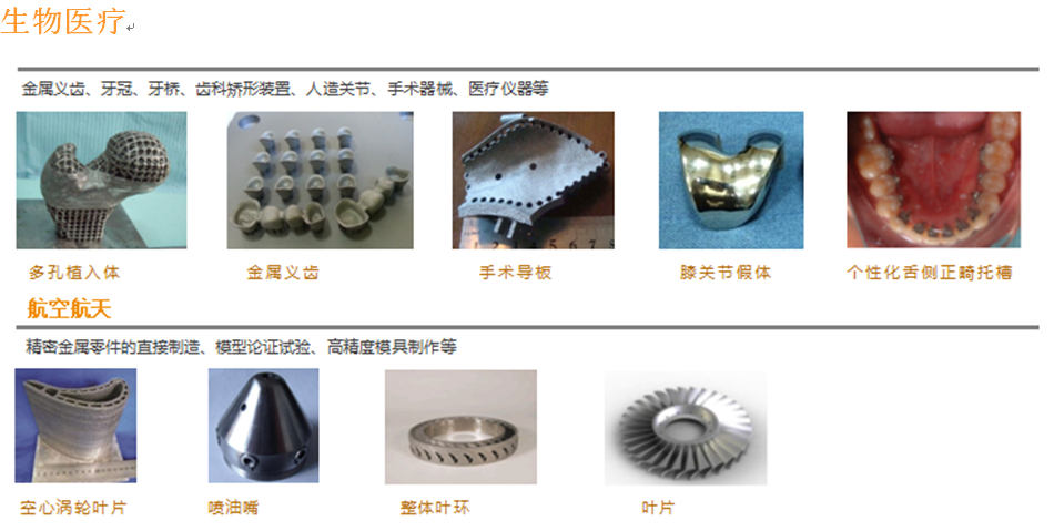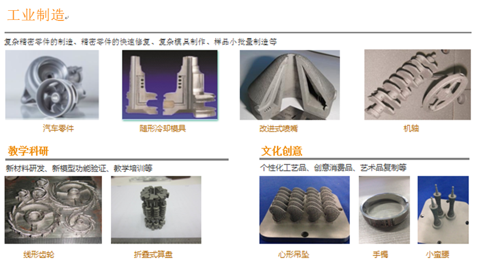 應用領域:生命醫(yī)學、航空工業(yè)、船用動力、軍械裝備、模具、精密機械零件、工業(yè)化機械零件樣品快速制造、個性化工藝品定制。